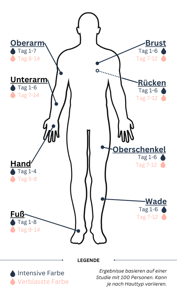 Die volle Farbe Ihres Tattoos kommt nach 24–36 Stunden zum Vorschein. Die Haltbarkeit beträgt dann 1-2 Wochen! Die Tinte verblasst allmählich, während sich die Haut auf natürliche Weise regeneriert.