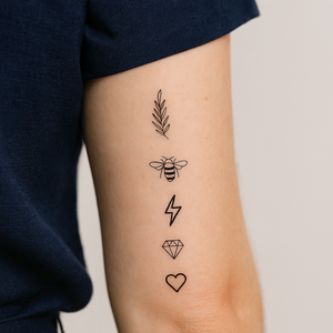 Dai un tocco di natura e simbolismo al tuo stile con il set di tatuaggi Nature's Symbols. Questa combinazione unica di 5 disegni - ape, diamante, cuore, fulmine e foglia - rappresenta eleganza, forza e individualità. Che tu stia cercando un accessorio discreto o un pezzo forte, questo set è perfetto per tutte le occasioni.