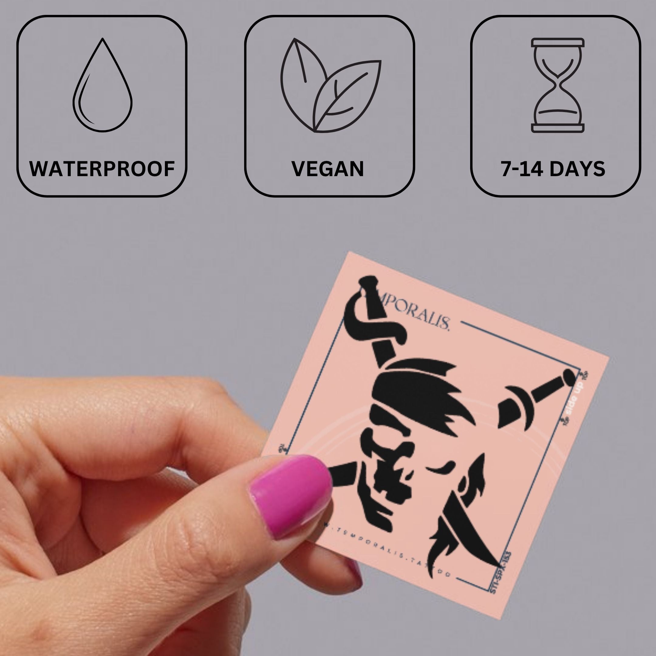 Il nostro tatuaggio Pirate Skull è perfetto per chi ama un tocco di avventura e mistero. Questo tatuaggio temporaneo naturale, realizzato con cura, ti permette di incanalare il pirata che è in te senza un impegno a lungo termine.
