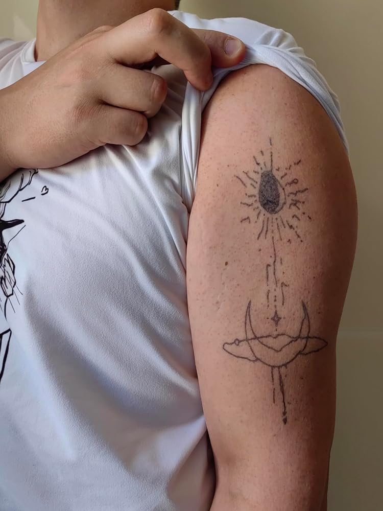 Dit elegante ontwerp, geïnspireerd op de mystieke uitlijning van de zon, maan en sterren, is perfect voor liefhebbers van minimalistische tatoeages die een gedurfd statement maken. De geometrische en abstracte elementen gaan naadloos in elkaar over en creëren een harmonieuze balans die elke outfit en gelegenheid zal opwaarderen.