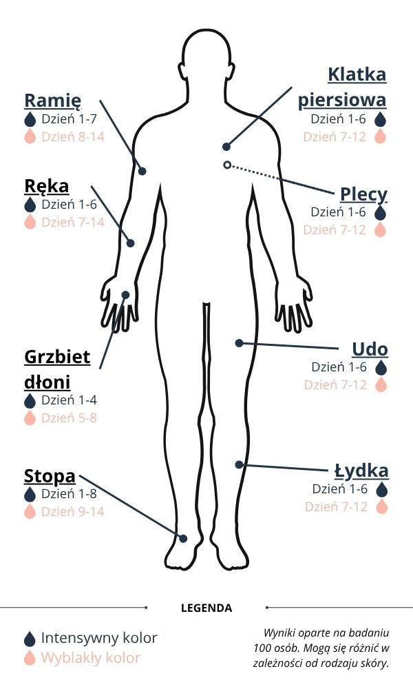 Pełny kolor tatuażu pojawi się po 24–36 godzinach. Następnie utrzyma się przez 1–2 tygodnie. Tusz będzie stopniowo blaknąć wraz z naturalną odnową naskórka.